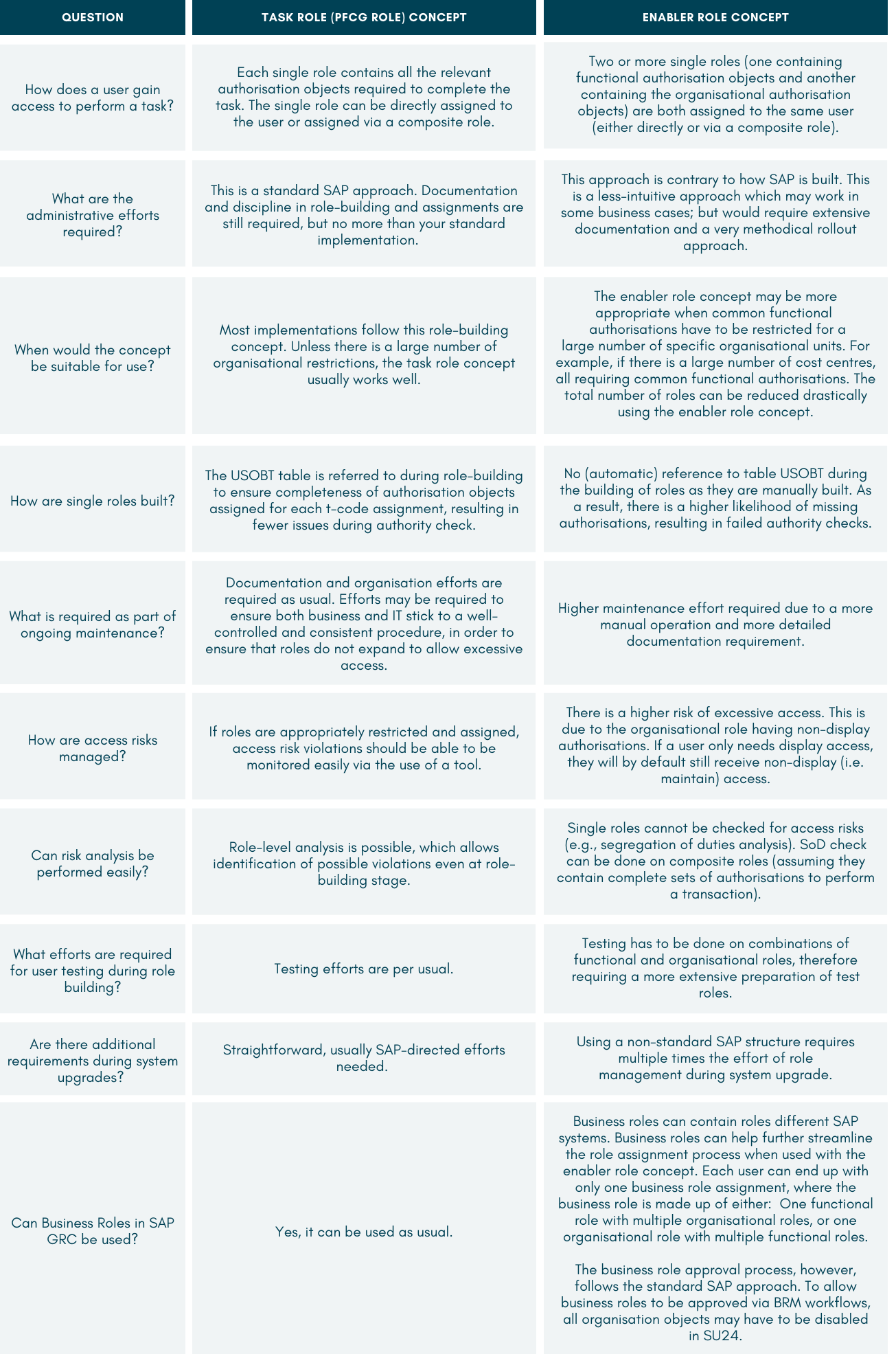 This is not to say that the enabler role concept has no place in SAP implementations – we have seen instances where it might be more suitable. One of our clients, for example, had numerous company codes within one SAP system. In each company code, there were multiple employees with the same job role but different organisational authorisation requirements – a legacy that proved complicated to simplify due to their data privacy requirements.