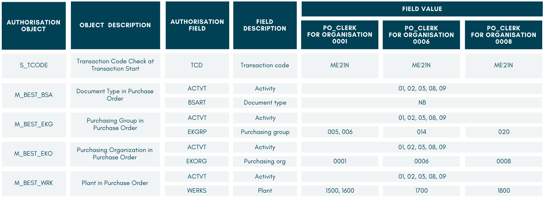 Consider the authorisation objects required for creating POs (i.e., per PO_CLERK role above). These authorisation objects have to be assigned the appropriate field values. Let’s assume there are three organisational units setup within one SAP system. These are the values required to create POs for these units: