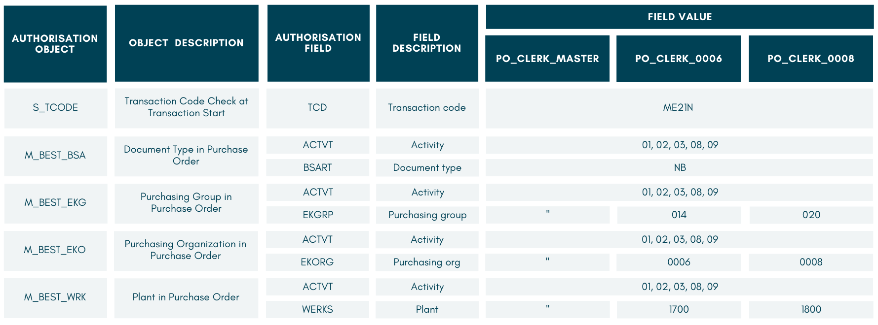 Additionally, a role name should also indicate the level of additional restriction it carries, for example when it only allows access to a specific organisation unit. One role that we will discuss in an upcoming section is PO_CLERK_0006. This role allows access to raise POs for purchasing organisation 0006 only.
